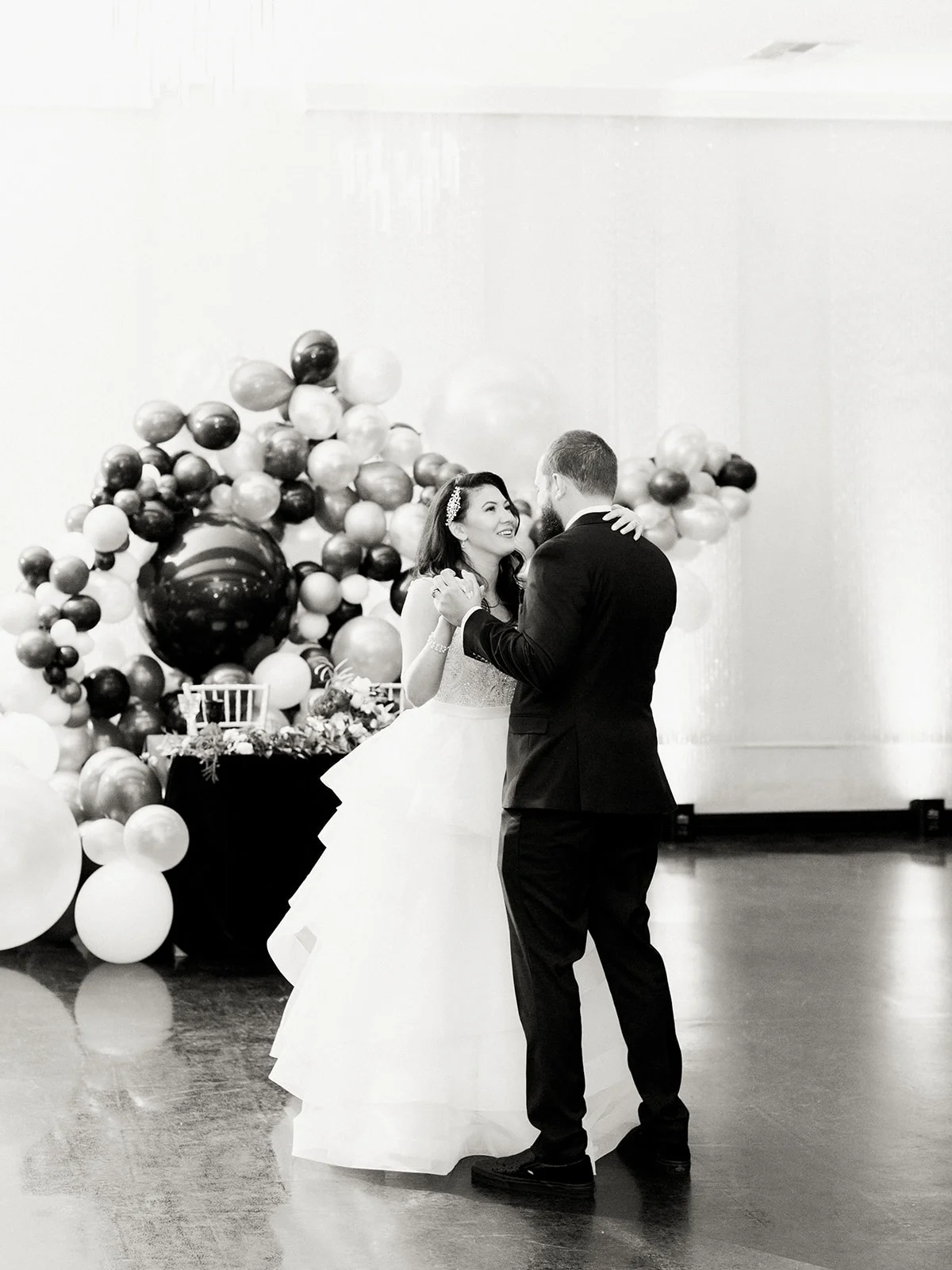 We started planning and designing with K& T many months prior to their wedding day. Kellye knew she wanted the bridesmaids in burgundy velvet dresses and Trevor knew he wanted to wear his sweet evergreen velvet Vans. So, we took those ideas and ran with it. Lucky for us, BBJ came out with some fabulous velvet linens last year. We knew that was where we needed to start. I wouldn’t say Kellye & Trevor had a “black tie” wedding, but everything is fancier on NYE, right? The combo of black velvet linens with evergreen velvet napkins was just what the night needed in order to step up the overall look and feel of their event. And what better way to celebrate than with balloons. Tremaine Events recently added balloon installations to their lists of talents and we just knew we needed to use them for that. We had them create several balloon garlands using some of the wedding colors and different sized balloons. Needless to say, we couldn’t be happier with how it all turned out. We also decided to get creative with our table setup and numbers. We made 4 large “X” tables in their reception using a combo of 8 foot tables and low boy cocktail tables. We then used big round balloons with table numbers written on them to differentiate the 4 tables. This made their reception feel super unique and also allowed for a larger dance floor. This group sure knew how to have a good time…and all of it was captured perfectly by Ball Photo Co.